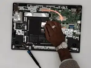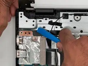 Используйте инструмент для поддевания или руки, чтобы приподнять левый шарнир вверх, пока он не освободится от дочерней платы.