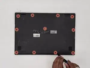 Используйте отвертку Phillips #1, чтобы удалить одиннадцать винтов длиной 8 мм, закрепляющих нижний корпус.
