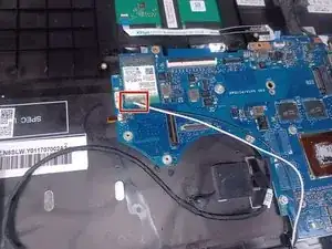 Поднимите оранжевый язычок под Wi‑Fi картой и вытащите провод.