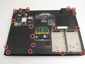 Уложите устройство горизонтально и удалите 17 винтов Phillips #0 диаметром 7 мм.