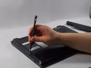 Переверните ноутбук так, чтобы нижняя часть устройства была направлена вверх, а петля — от Вас.