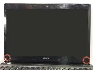 Снимите два заглушки винтов в нижней части по бокам рамки экрана с помощью плоского инструмента.