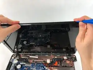 С помощью пластикового инструмента для вскрытия пройдите по шву, идущему по периметру ноутбука, чтобы отделить нижнюю крышку от модуля подставки для рук.