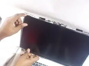 Осторожно возьмите края крышки экрана с противоположных концов и потяните экран к себе.