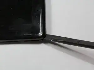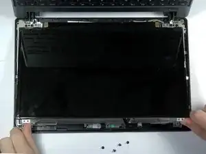 Переверните устройство на 180 градусов, держа экран на столе. Используйте лопатку на нижней части экрана, чтобы отсоединить рамку между петлями.