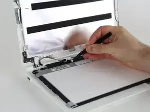 Используйте пинцет, чтобы снять наклейку, удерживающую кабель на ноутбуке за экраном.
