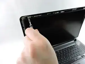 Откройте ноутбук и снимите рамку передней панели экрана с помощью инструмента для вскрытия или пластиковой лопатки.