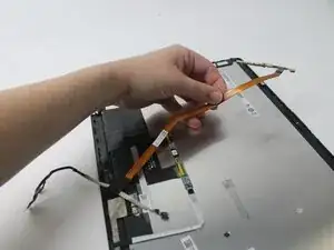 Поднимите угол экрана, соответствующий первой петле. Протяните провод по краю экрана с другой стороны петли. Аккуратно прижмите провод к рабочей поверхности.