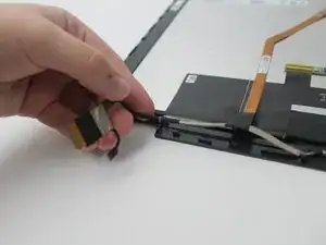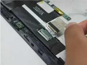Потяните вверх два язычка, чтобы отключить последние два ленточных кабеля.