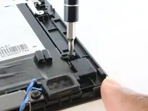 Удалите два винта Phillips #0, 3,5 мм, по одному с каждой стороны разъёма клавиатуры.