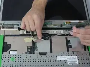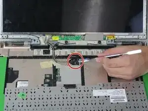 Потяните чёрную фиксирующую язычок вверх с помощью металлической лопатки, чтобы отсоединить кабель от дисплея.