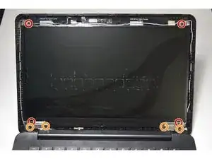 В некоторых версиях вместо этого могут быть шесть больших винтов (четыре в верхней части изображения, рядом с петлёй, и два по бокам) и пять меньших (четыре в нижней части изображения, где ноутбук тоньше, и один в центре).
