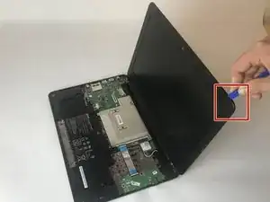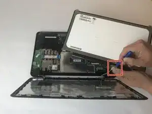 Используйте пластиковый инструмент для отсоединения провода, который соединяет экран с нижней частью ноутбука, не имеющей дисплея.