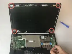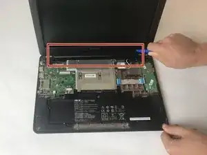 Используйте пластиковый инструмент для открытия, чтобы снять пластиковый корпус петли, расположенный между экраном и клавиатурой.