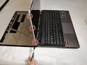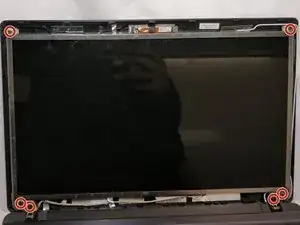 С помощью отвертки JIS #00 снимите шесть винтов по 5 мм, соединяющих заднюю панель и экран в каждом из четырех углов экрана.
