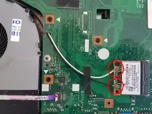 Отклейте и отсоедините кабели Wi‑Fi (коаксиальные разъёмы) от модуля Wi‑Fi.