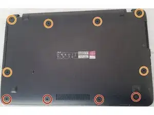 Удалите оставшиеся 6 винтов ~14 мм с нижней части компьютера. Желтые окружности.
