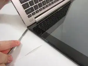 Возьмите металлическую лопатку и вставьте её под экран.