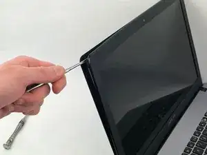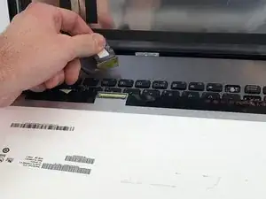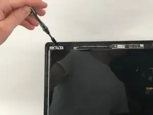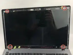 Под экраном должно быть четыре серебряные скобы, удерживающие его на месте. Открутите центральные винты 3,35 мм в каждой скобе, как показано, с помощью отвертки JIS 00.