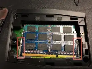 Нажмите наружу на защёлки, чтобы освободить планку оперативной памяти. Планка должна подняться под углом.