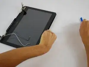 Используйте пластиковую лопатку, чтобы аккуратно поддеть нижнюю часть ноутбука. Медленно продвигайтесь вдоль краёв, периодически покачивая лопатку, чтобы отсоединить нижнюю часть от защёлок.