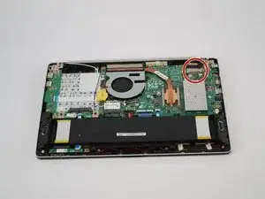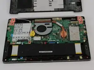 Выкрутите четыре винта длиной 5 мм, Phillips #1, расположенные в верхней части ноутбука.