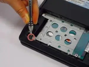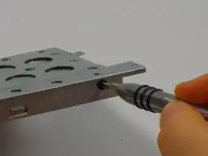 Удалите два винта с крестообразным шлицем длиной 3 мм, по одному с каждой стороны металлического корпуса, удерживающего жёсткий диск, используя биту PH0.