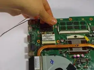 К нижней части материнской платы всё ещё подключены два провода, поэтому снимайте осторожно.