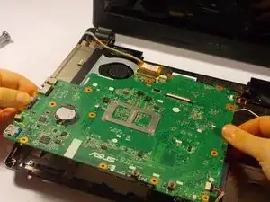 Переверните материнскую плату и положите её рядом с основанием ноутбука.