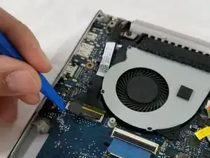 Удалите три винта Philips #00 размером 4 мм в петле, чтобы ослабить вентилятор материнской платы.