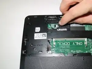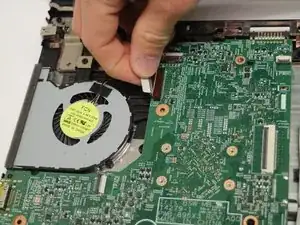 Пальцами отсоедините кабель динамика от материнской платы, потянув белый разъём в сторону от гнезда.