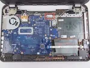 Отключите кабель дисплея в верхней правой части материнской платы.