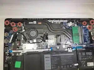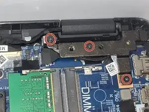 Удалите один винт Phillips #0 размером 4.55 мм и шесть винтов Phillips #0 размером 2.5 мм, которые крепят петли дисплея к системе.