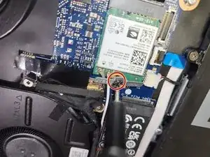 Удалите винт Phillips #0 размером 2 мм, который крепит кронштейн карты WLAN к карте WLAN на системной плате.