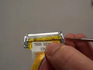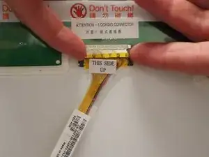 Ленточный кабель в верхней части экрана использует замковый разъём. Аккуратно сожмите язычки по обеим сторонам, чтобы разблокировать, и потяните ленточный кабель вниз, в сторону низа экрана.