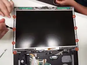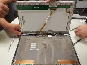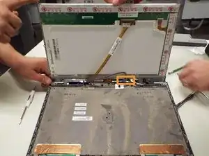 Аккуратно приподнимите экран, следя за ленточными кабелями.
