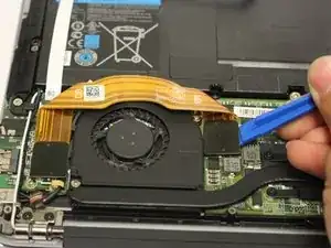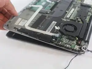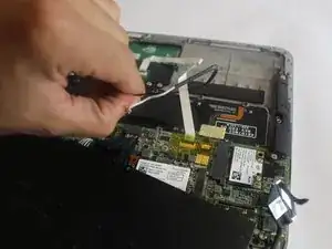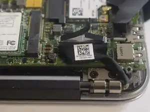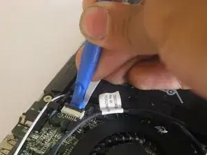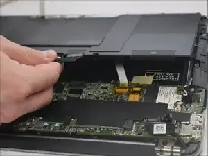 Снимите чёрный провод, соединяющий экран с материнской платой, потянув вверх пластиковым инструментом для вскрытия.