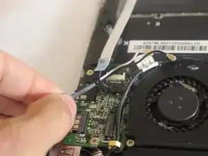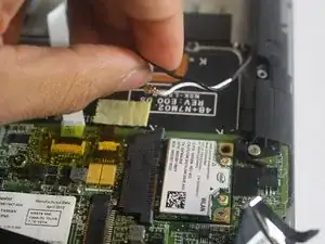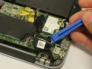 Отключите провод, подключённый к беспроводной плате, пластиковым инструментом для вскрытия, осторожно поднимая, затем отведите провода в сторону.