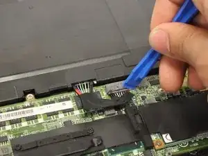 Вставьте пластиковый инструмент для вскрытия между портом и проводами, чтобы отсоединить кабель батареи.