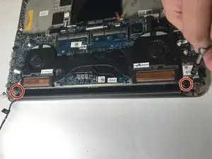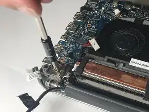 Используя крестовую отвертку #0, выкрутите два винта длиной 2,5 мм, крепящих SSD к шасси.