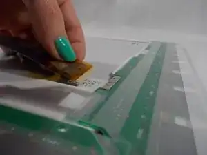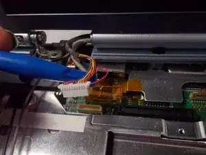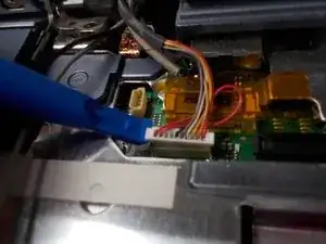 Используйте пластиковый инструмент для вскрытия, чтобы освободить ленточный кабель от материнской платы.