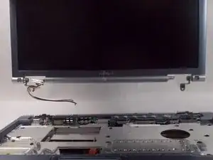 К клавиатуре присоединён ленточный кабель к материнской плате. Поднимайте клавиатуру аккуратно, чтобы не повредить его.