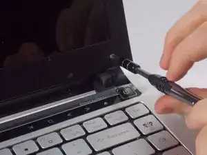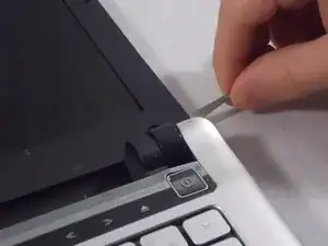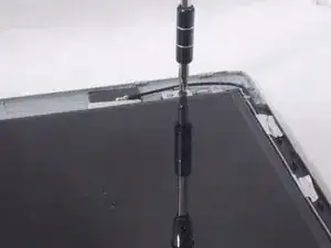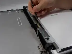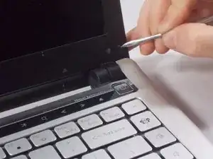 Используйте небольшой металлический лопаточный инструмент, чтобы снять маленькие чёрные заглушки винтов в нижних углах экрана.