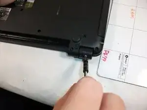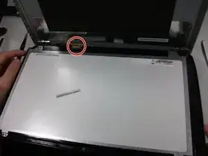 С помощью заостренного пинцета удалите пластиковые кружки, приклеенные к задней стороне петель ноутбука.