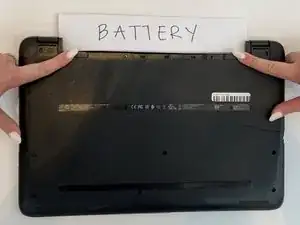 Ориентируйте ноутбук так, чтобы логотип HP был лицом к столу, а вкладки аккумулятора были доступны.
