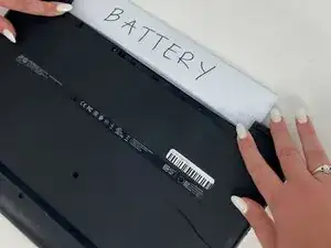 Используя указательные пальцы, нажмите на зажимы держателя аккумулятора внутрь (в центр ноутбука).
