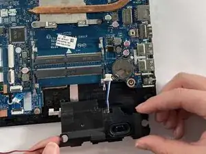 Выньте правый динамик, сдвинув его слева направо.