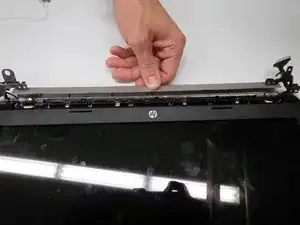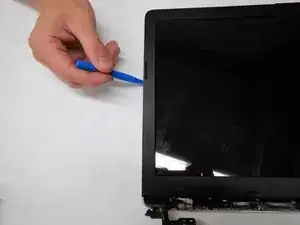 Начиная с области рядом с петлями, аккуратно удалите клеящуюся рамку дисплея вокруг экрана с помощью инструмента для вскрытия iFixit.
