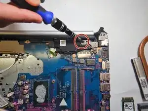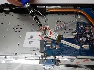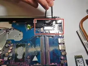 Удалите винт Phillips #0 3 мм, фиксирующий карту WLAN.