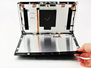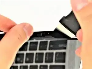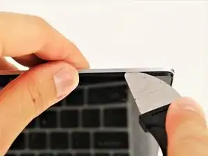 Медленно вставьте отвёртку-лопатку между чёрной рамкой экрана и серебристой задней панелью дисплея, затем поверните её вверх и от себя, пока панели не разъединятся.